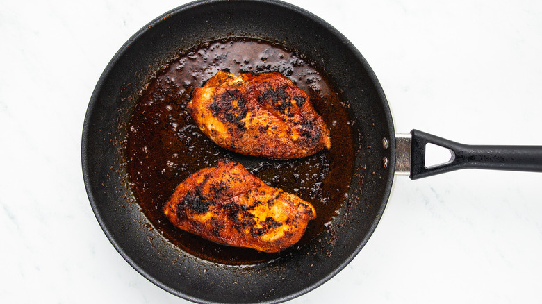 Fry the chicken breasts until blackened and cooked through, about 5-6 minutes per side. Once fully cooked, the internal temperature of the chicken should be 165 F.